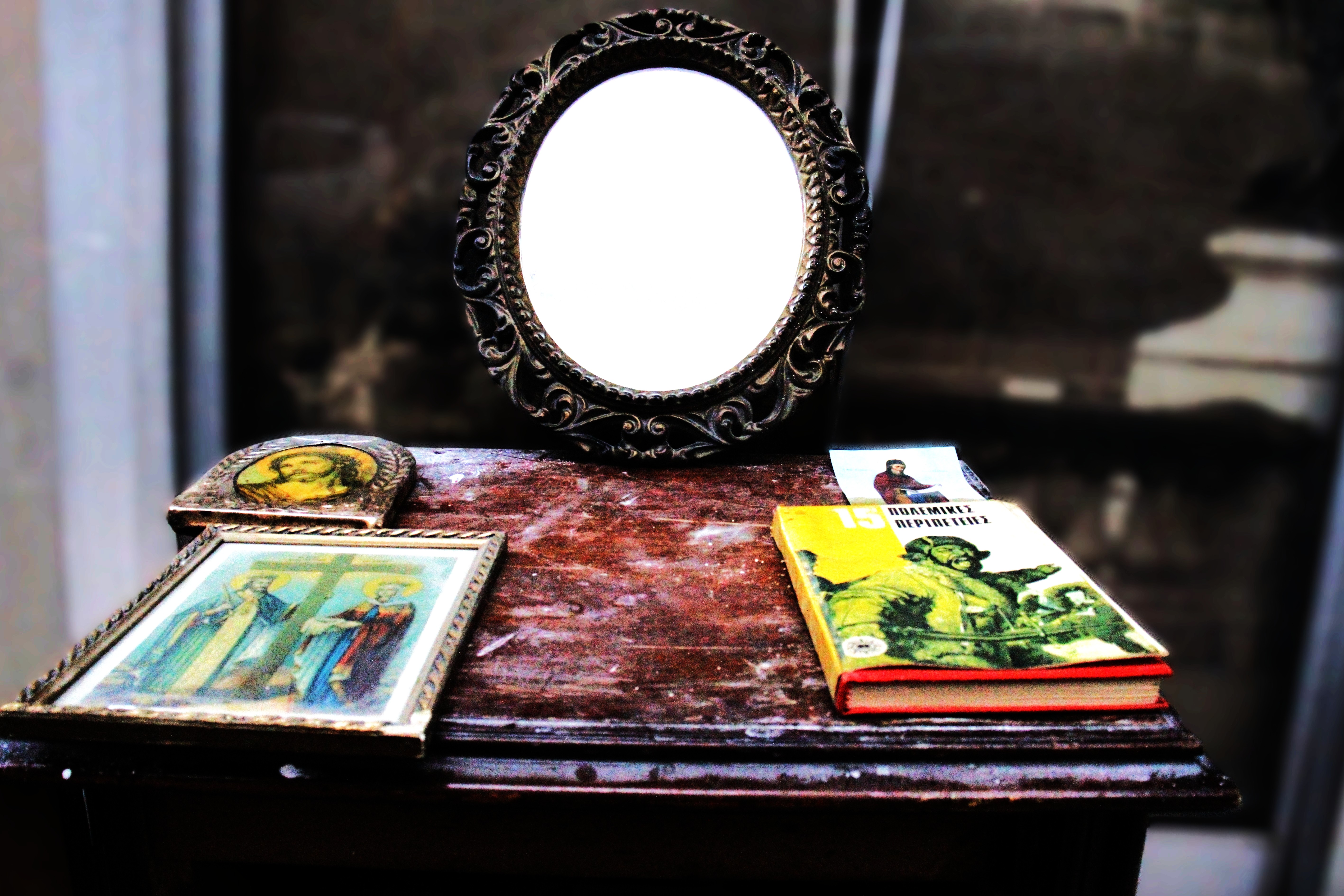 Ένας βιβλίο  15 Πολεμικές Περιπέτειες που κυκλοφόρησε το 1968, ένα παλιός καθρέφτης όσο να έχουν καθρεφτιστεί πάνω του 100  πρόσωπα. Και μικρές φτηνιάρικες χριστιανικές εικόνες. Ο καθρέφτης ήταν το στοίχημα. Τον έβλεπα μ’ έναν συναρπαστικό τρόπο τρομαγμένος. Ένιωσα μέσα του κινήσεις ανθρώπων που κοιτάχτηκαν με το είδωλό τους. Πόσο βάθος έχει ένας καθρέφτης; Από πόσο βαθιά στο παρελθόν έρχονται τα πρώτα χέρια που καταγράφηκαν  σ’ αυτόν;  Σαν αβυθομέτρητη θάλασσα και γι’ αυτό τρομακτική για τα είδη ζωής που μένουν  ακατάγραφτα απ’ τους ωκεανογράφους στις αβύσσους της, ο καθρέφτης είναι ο οφθαλμός των σπιτιών, το άγρυπνο μάτι που κοιτά και μεταβολίζει εγκλήματα και χαρές των ανθρώπων. Στέκομαι μπροστά στα παντοειδή  κάτοπτρα και φοβάμαι τα περάσματα   άλλων όντων που αναβλύζουν απ’ το κοίταγμα μου πάνω  στην γυάλινη επιφάνεια τους. Κοιτάζω τον καθρέφτη στο σπίτι μου και αναπολώ τον πατέρα μου που πέθανε  εδώ μέσα στην Καλλιθέα, νιώθω πως είναι κάπου στο βάθος του αντικατοπτρισμένου χώρου και ξέρω ότι κάποτε θα τον δω.  Όταν με τον θάνατό μου θα έχω μπει κι εγώ για πάντα μέσα στον καθρέφτη.