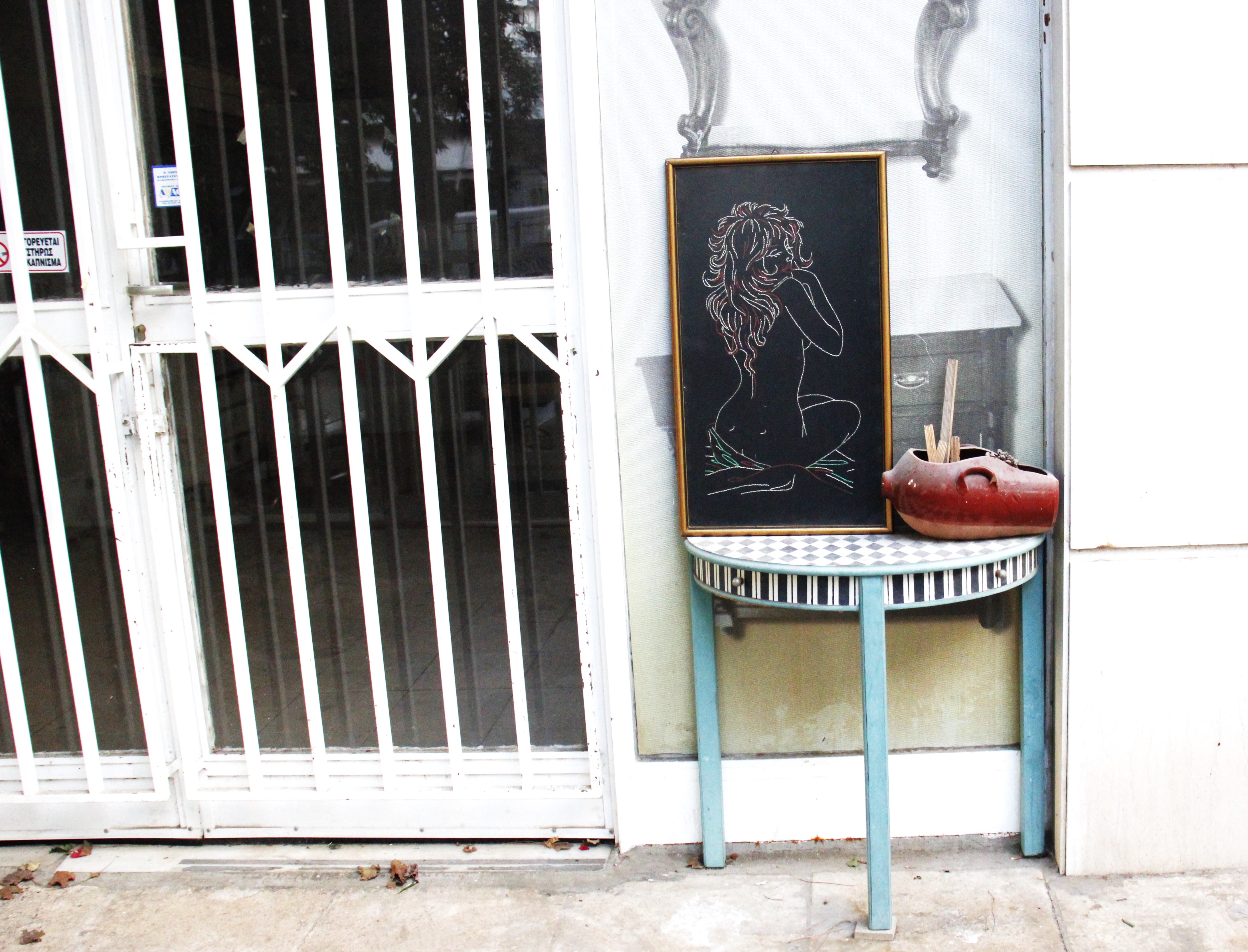 Άλλη μια σκηνοθετημένη φωτογραφία. Βρήκα κάτω αυτήν την διακοσμημένη με κλωστές γυμνή γυναίκα και την μόστραρα κάτω από μια αφίσα μ’ έναν παλαιού τύπου καθρέφτη και ένα κλασικής μορφής κομοδίνο. Να σκηνοθετώ τις εικόνες μου σημαίνει να κάνω τα σύμβολα τους πιο προφανή. Εδώ θέλησα να μιλήσω για την φιλαρέσκεια και είπα ας βάλω την γυναίκα (που τυχαία βρήκα) δίπλα στην εικόνα με τον καθρέφτη. Αναρωτιέμαι αν η Καλλιθέα είχε φύλο , τί φύλο θα ήταν αυτό; Ίσως κάποια στιγμή, όταν οι φωτογραφίες θα έχουν γίνει χιλιάδες να εξιχνιάσω τούτο το μυστήριο. Μέχρι τότε θα συνταιριάζω πράγματα από ετερόκλητα ευρήματα. Όλες οι κλεψιγαμίες έχουν ένταση πολύ περισσότερη απ’ την τοποθέτηση ενός τιμαλφούς στην φυσική θέση.